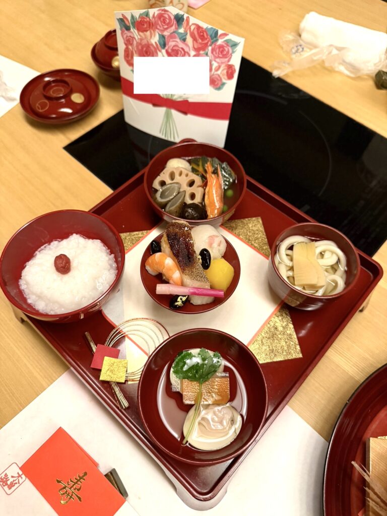 息子のお祝い膳は、お粥・うどん・かぼちゃ・里芋・焼き魚などがあり、食べられるものも多く、ほぼ完食しました。離乳食を持参していましたが、結果的には不要でした。